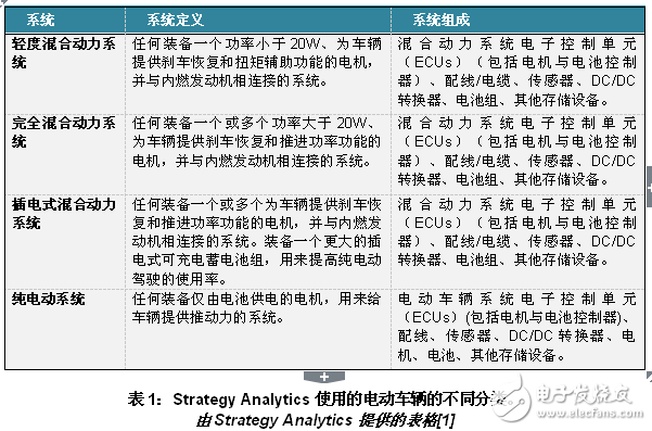 隨著世界范圍的人們對更高能源效率的交通方式的需求增加,HEV/EVs將首當其沖,成為人們的首要選擇的交通方式。為了更好的了解電動與混合動力車輛市場的潛力與發(fā)展情況,我們不可避免的要知道在本文中提到的是什么類型的車輛。在Strategy Analytics[1]的報告中:“2007年到2021年混合動力車輛系統(tǒng)的需求預(yù)測,”將HEV/EV分為四類: