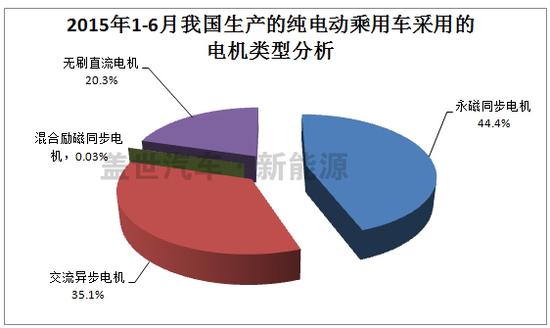 2015年我國純電動乘用車產(chǎn)量約為150000輛,其中上半年的產(chǎn)量約為39000輛?;旌蟿畲磐诫姍C(jī)全年裝機(jī)量200輛左右,上半年裝機(jī)量不足10輛;永磁同步電機(jī)全年裝機(jī)量68700輛,上半年17300輛;交流異步電機(jī)全年裝機(jī)量59000輛,上半年13700輛;無刷直流全年22360輛,上半年約7900輛。2015年上半年及全年各類型電機(jī)所占份額請見圖2、圖3所示。